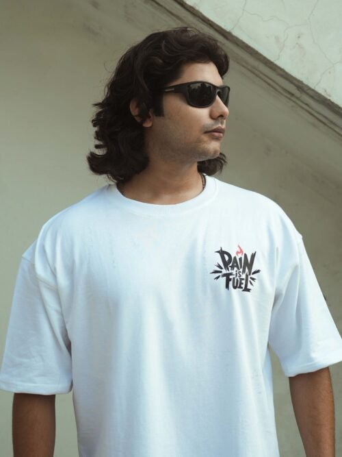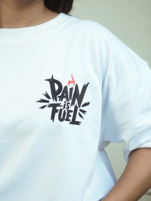 The “Pain is Fuel” tee is designed for those who turn struggle into strength. With a crisp white base and empowering text graphic on the front, this unisex oversized T-shirt delivers a mix of minimalism and raw energy. Made with 240 GSM premium cotton, it is both comfortable and durable for everyday wear.