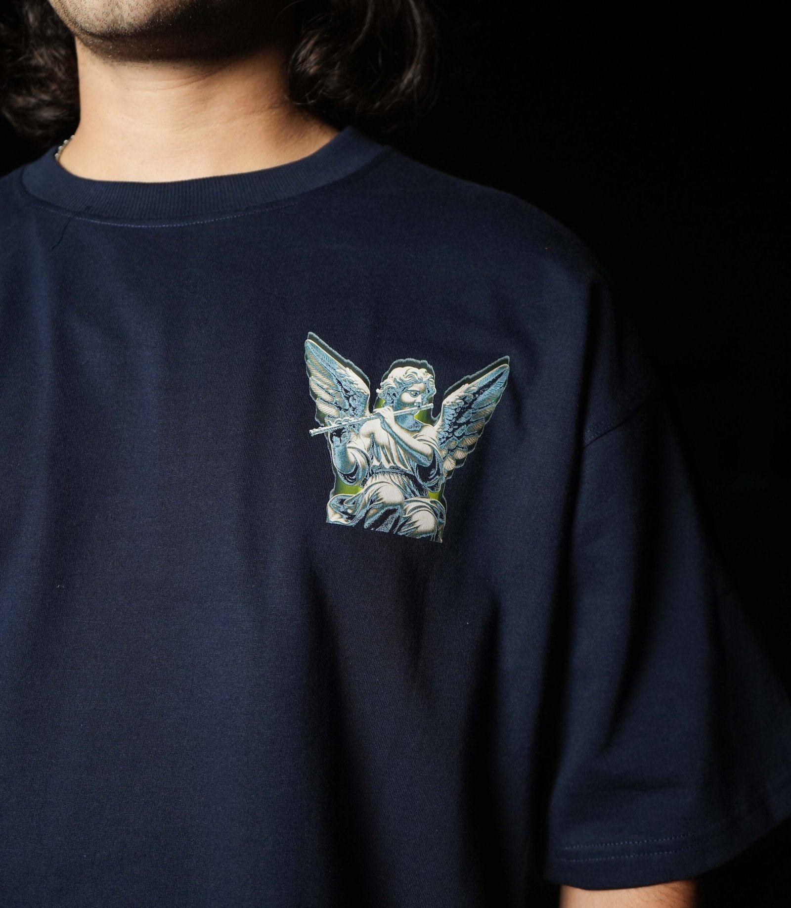 The “Revelation” tee draws inspiration from celestial art, with an angelic figure playing the flute as the centerpiece of the back print. Intricate typography and balanced detailing enhance the mystical aura of the design. Made from 240 GSM cotton, this oversized unisex tee delivers both comfort and expressive style, perfect for statement-making outfits.