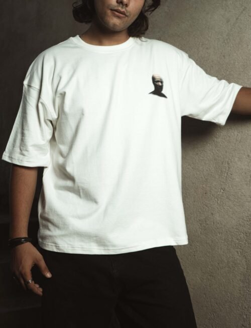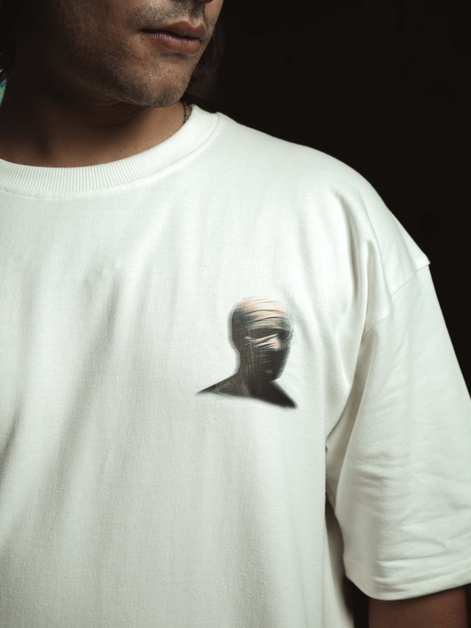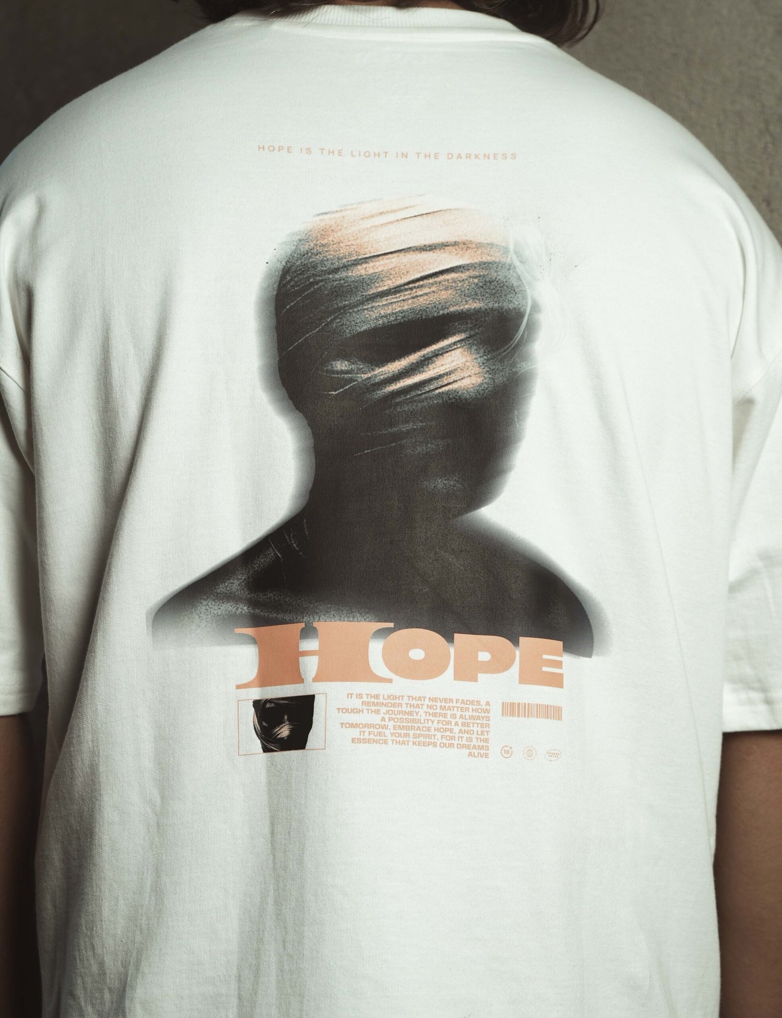 Unisex oversized off white T-shirt featuring large bold “HOPE” typography layered with distressed street-style effects, blending minimalism with strong urban expression.