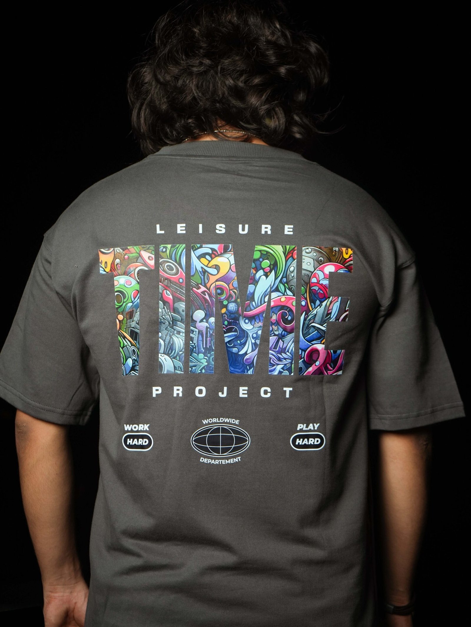 The “Leisure Time” tee embraces dark humor and bold street expression. Featuring a striking skeleton design with distressed lettering, this oversized unisex T-shirt captures a fearless and unapologetic tone. Built from 240 GSM cotton, it’s perfect for making a statement in alternative fashion and urban culture.