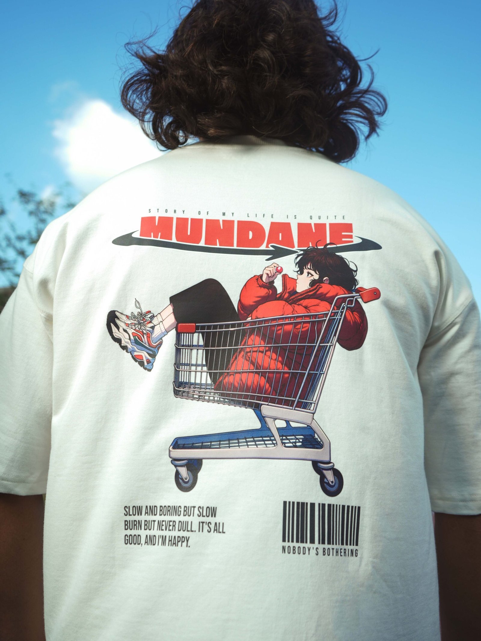 The “Mundane” tee delivers bold anime-inspired art with a whimsical character in a playful scene. Colorful graphics and layered text details enhance its vibrant look, making it ideal for fans of Japanese-inspired culture. Crafted with 240 GSM ultra-premium cotton, this oversized unisex tee ensures both comfort and standout appeal.