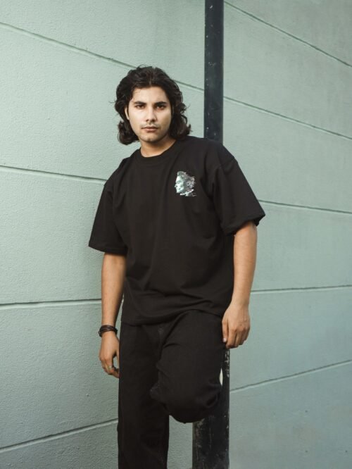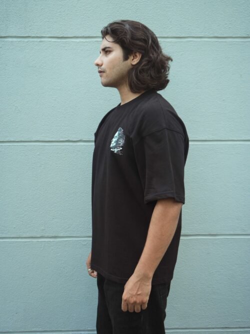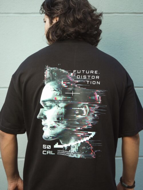 Step into tomorrow with the “Future Distortion” tee — a black unisex oversized T-shirt featuring a glitch-style digital head profile. Text accents like “Future. Distortion” and “50 Cal” highlight a cyberpunk aesthetic, merging tech visuals with philosophical undertones. Crafted with 240 GSM premium cotton, this piece embodies futuristic rebellion for bold streetwear lovers.