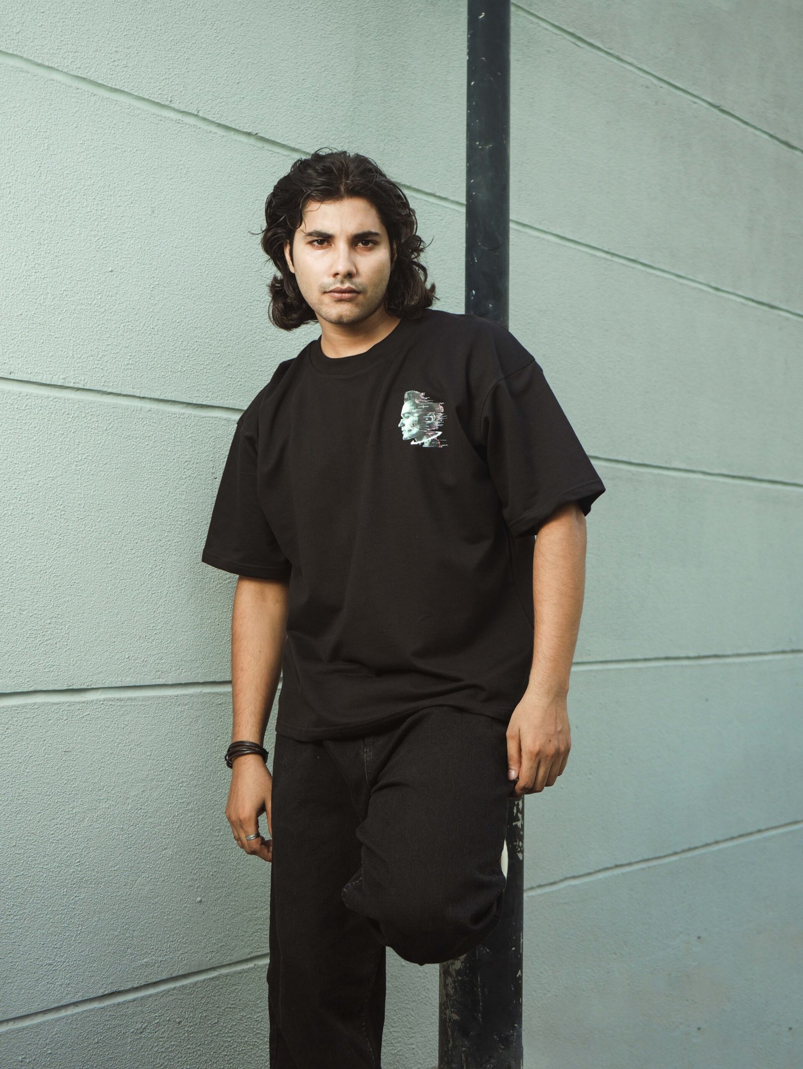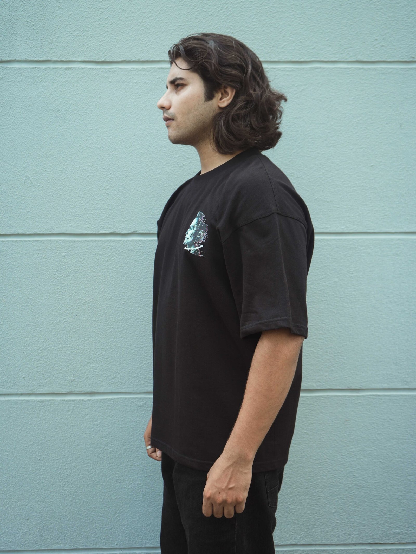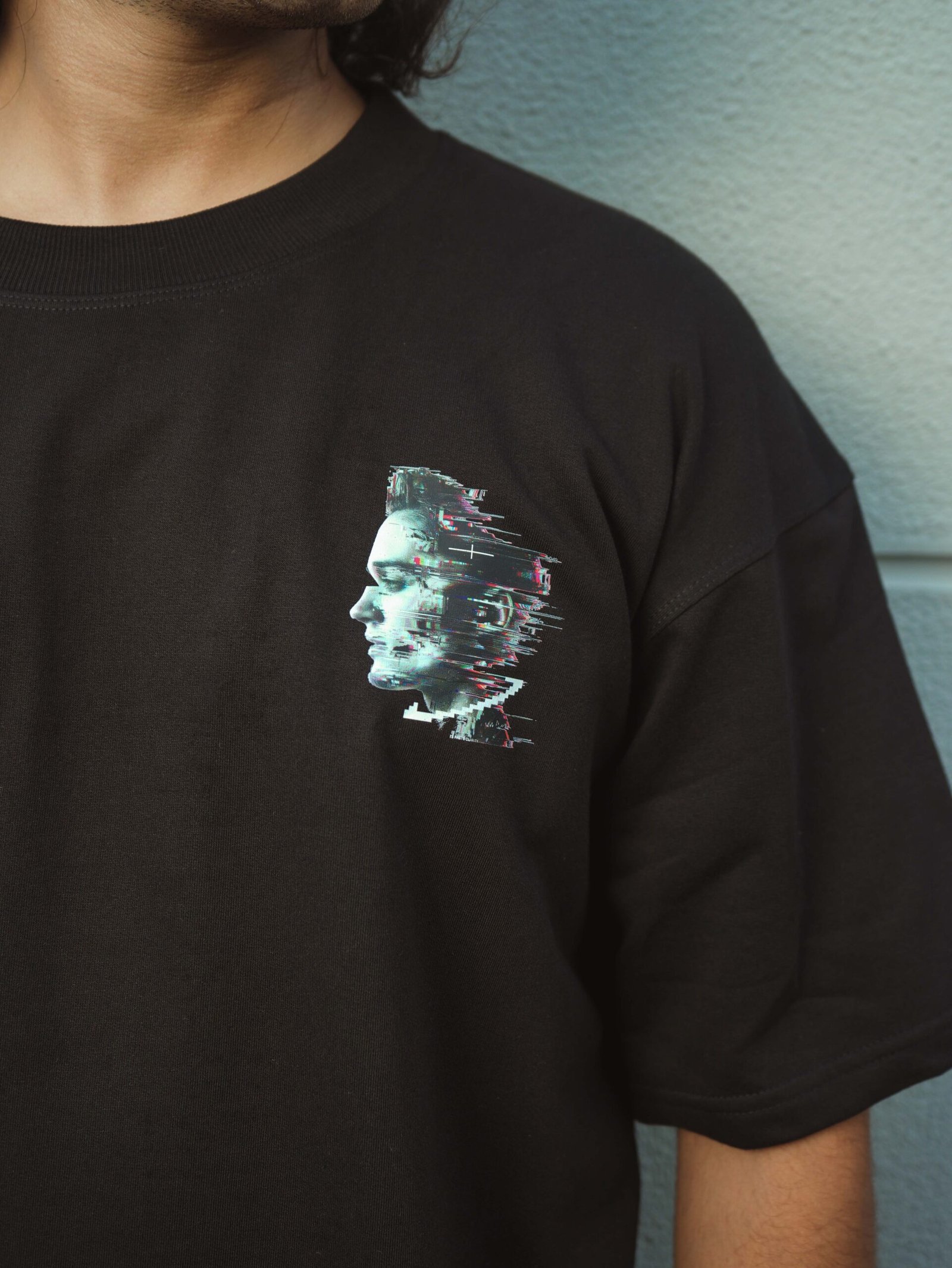 Unisex oversized T-shirt with glitch-inspired futuristic head profile artwork, merging cyberpunk aesthetics with bold rebellious urban streetwear energy.