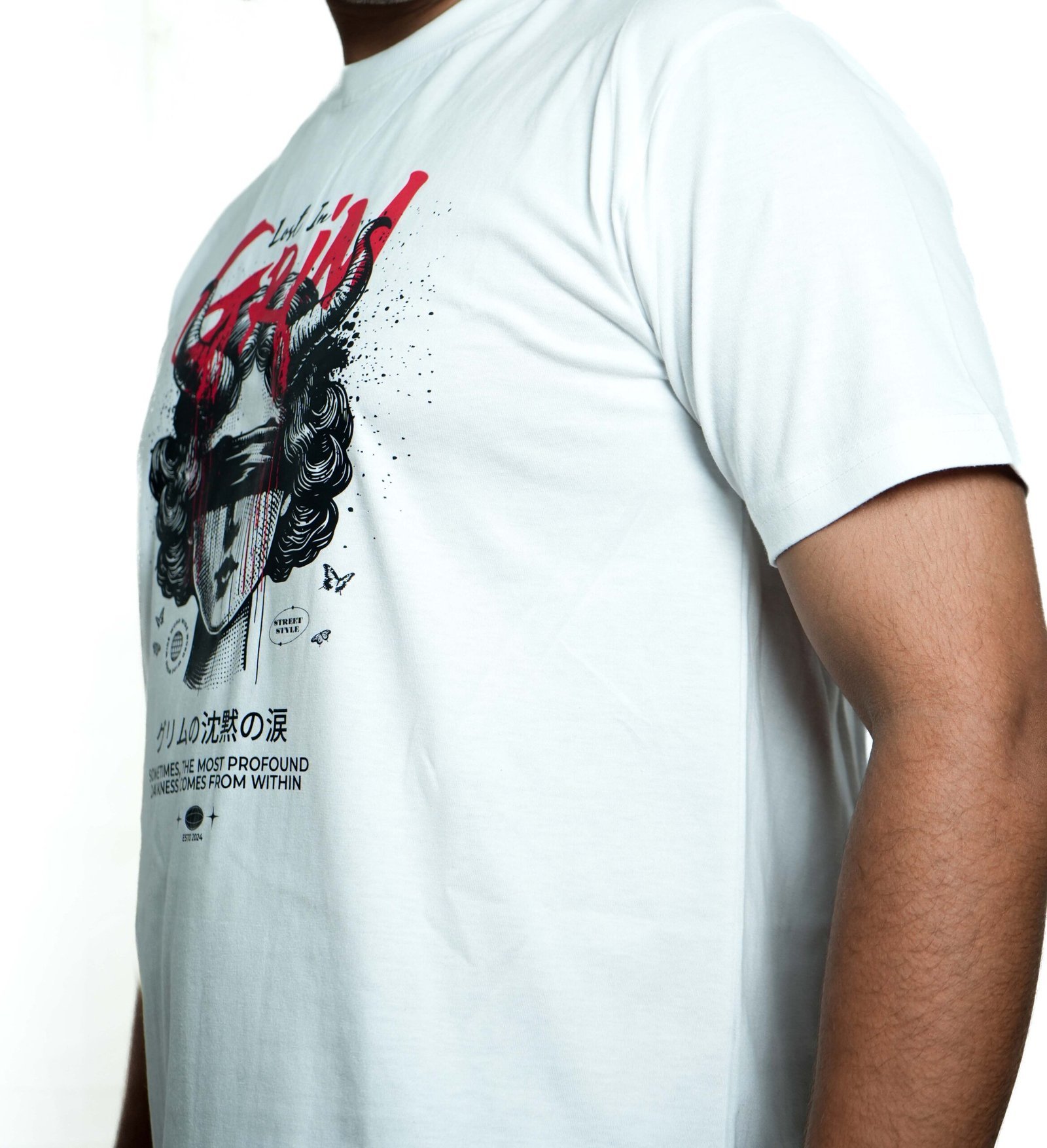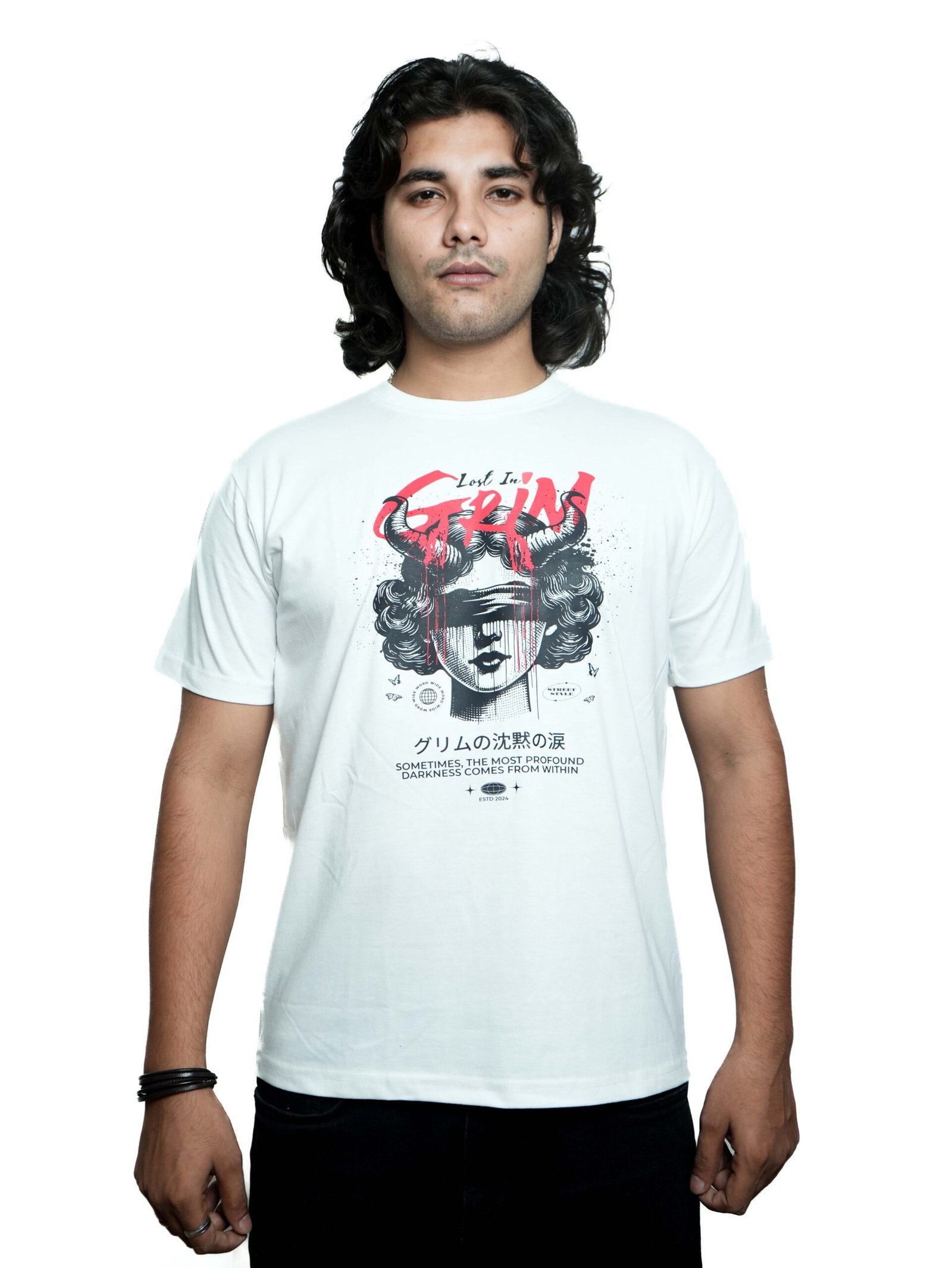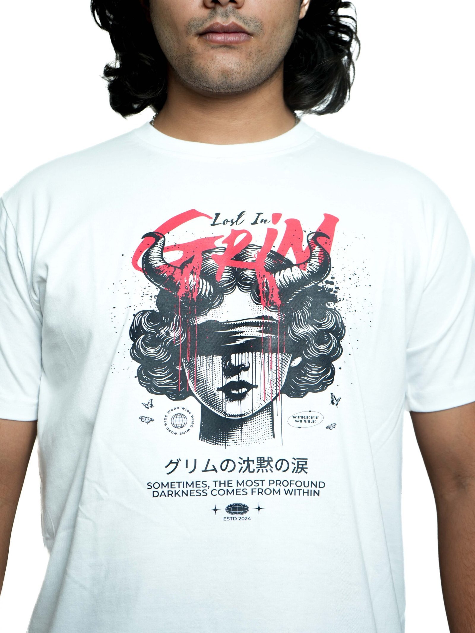 Stand out with the “Lost in Grim” white tee — bold art meets modern comfort for a street-ready look.