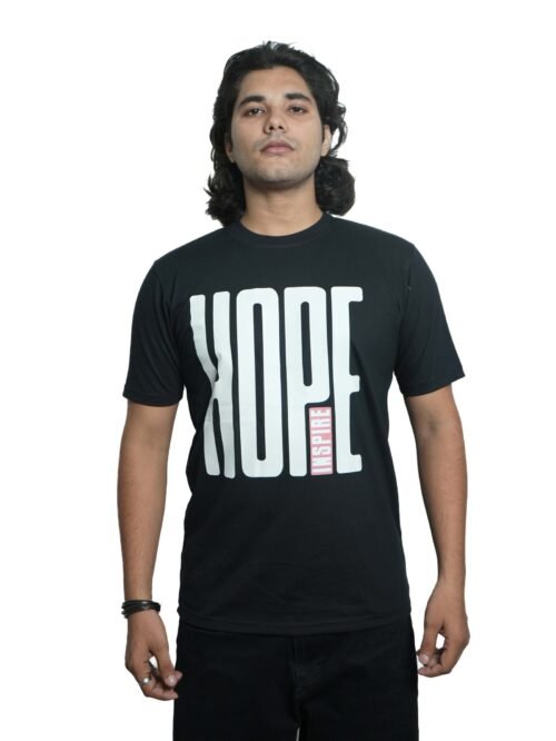 Make a bold statement with the “HOPE Inspire” tee — a sleek black unisex T-shirt that transforms positivity into style. Featuring oversized white typography with a striking red “INSPIRE” highlight, it’s a reminder that fashion can uplift as much as it impresses. Crafted with 180 GSM premium cotton, this tee blends durability with everyday comfort, making it a go-to for those who live with purpose and style.