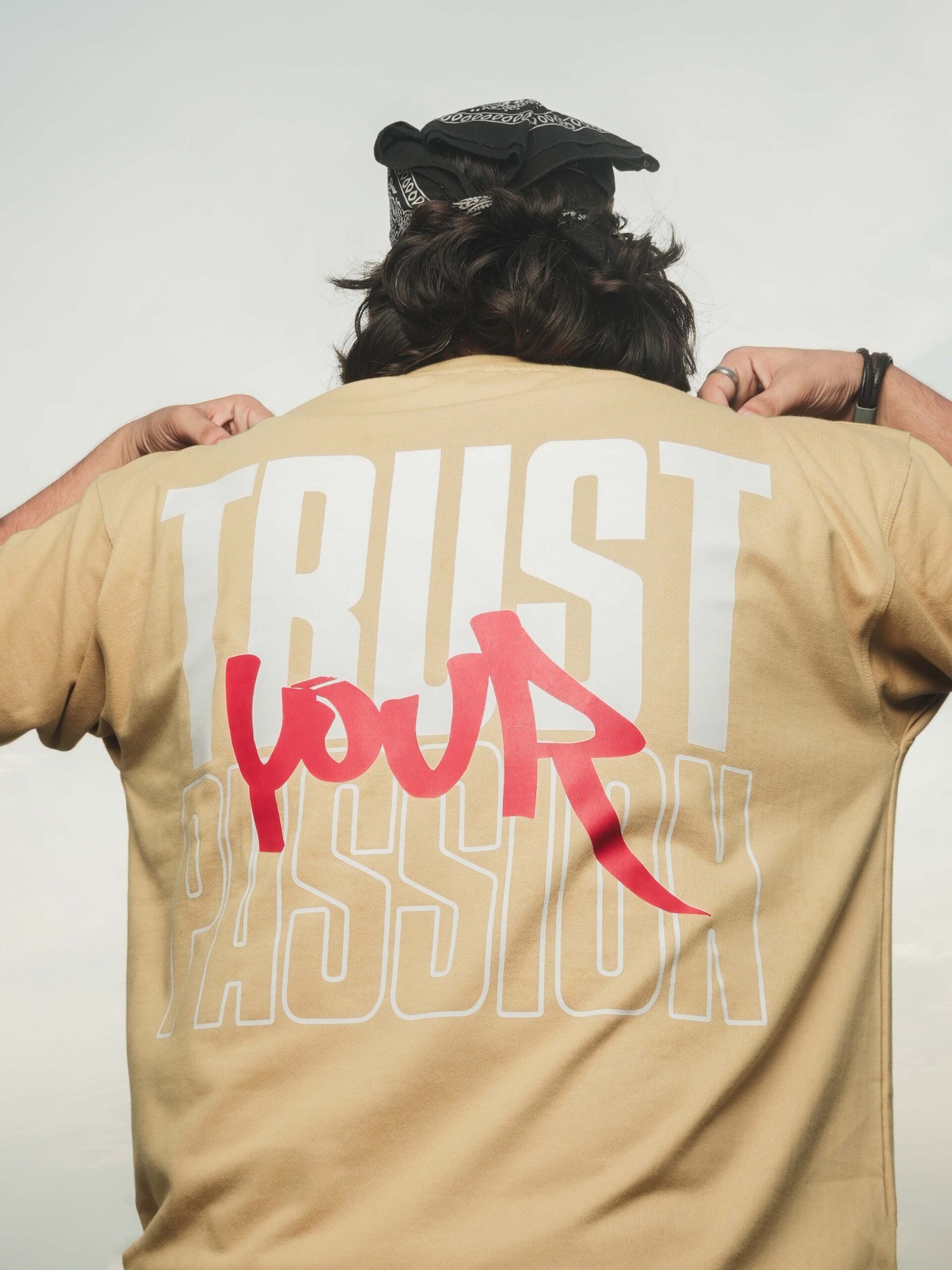 The “Trust Your Passion” tee makes a fearless statement with its striking graphic print. On the back, oversized outlined white block letters spell “TRUST” and “PASSION,” while the word “your” is layered across in bold red graffiti-inspired script, creating a high-contrast and dynamic effect. Designed with a relaxed oversized fit, this unisex T-shirt is made from 240 GSM premium cotton, offering comfort and durability with a modern urban edge.