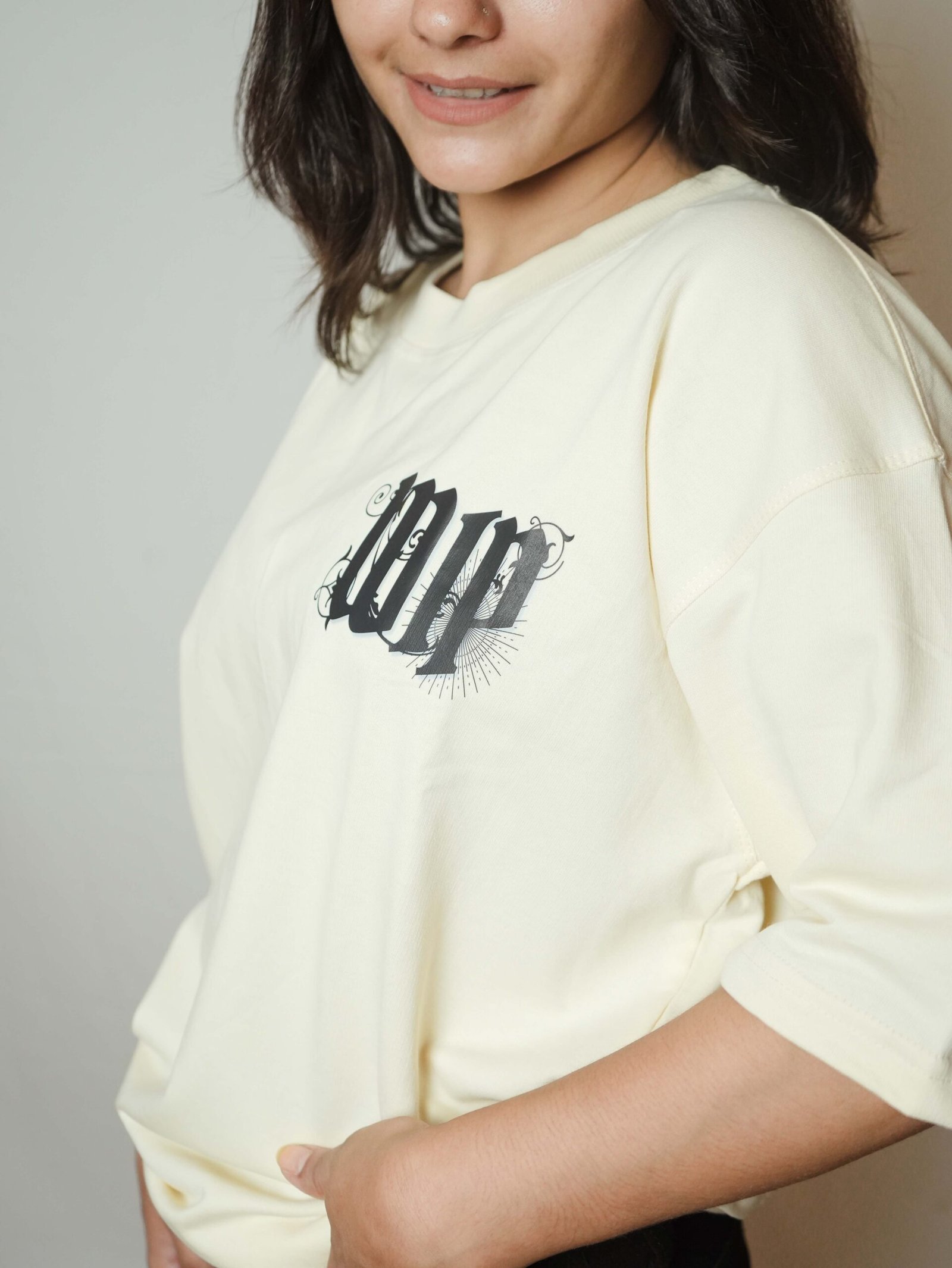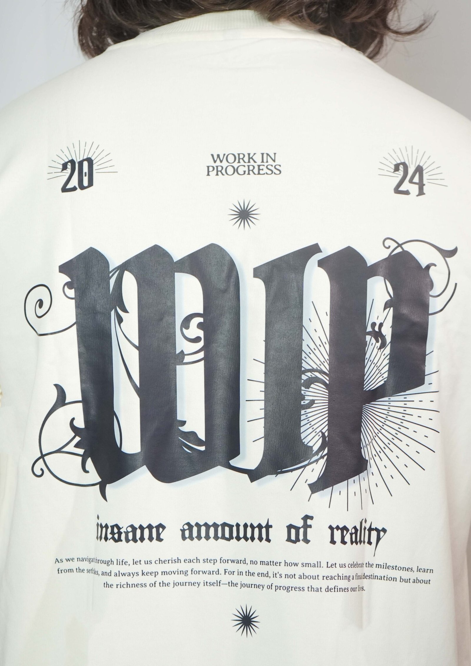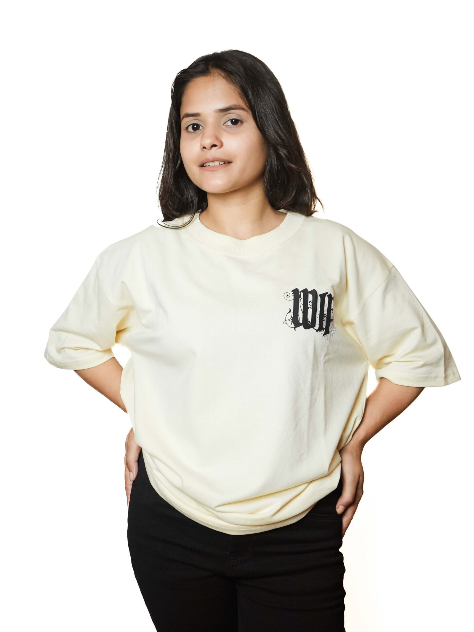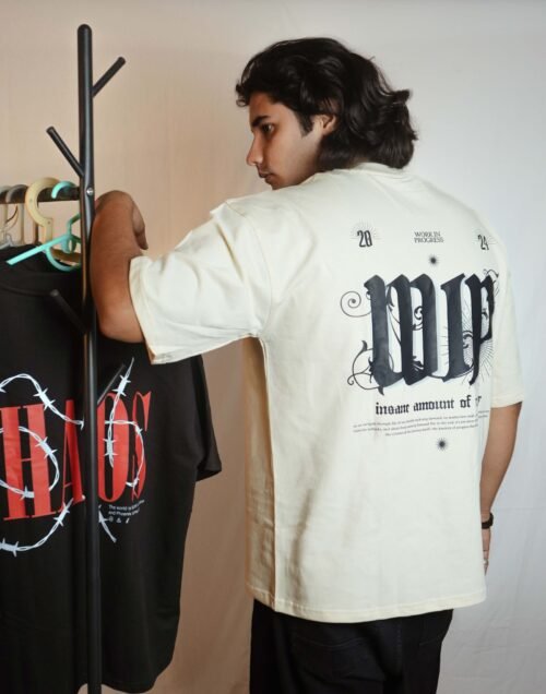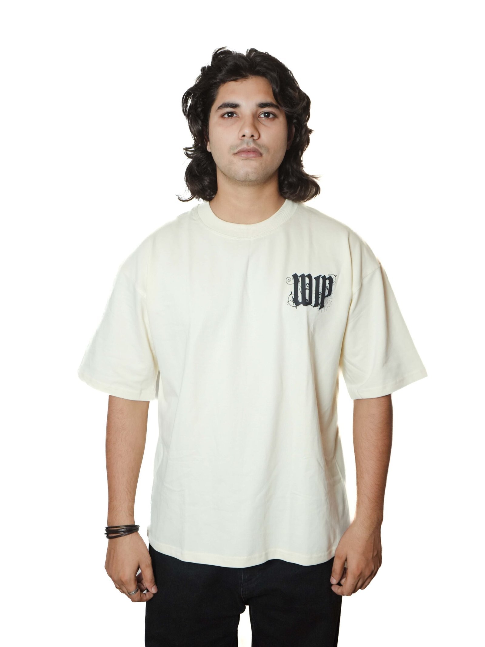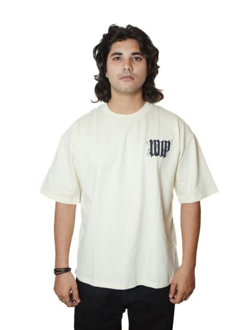 The “WIP” tee is designed for those who see beyond the surface. Its oversized unisex fit and powerful back graphic of stacked eyes, layered with symbols and words, give it a raw and mysterious aura. Made with 240 GSM cotton, it’s perfect for statement-driven streetwear.