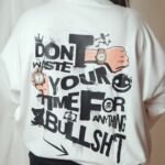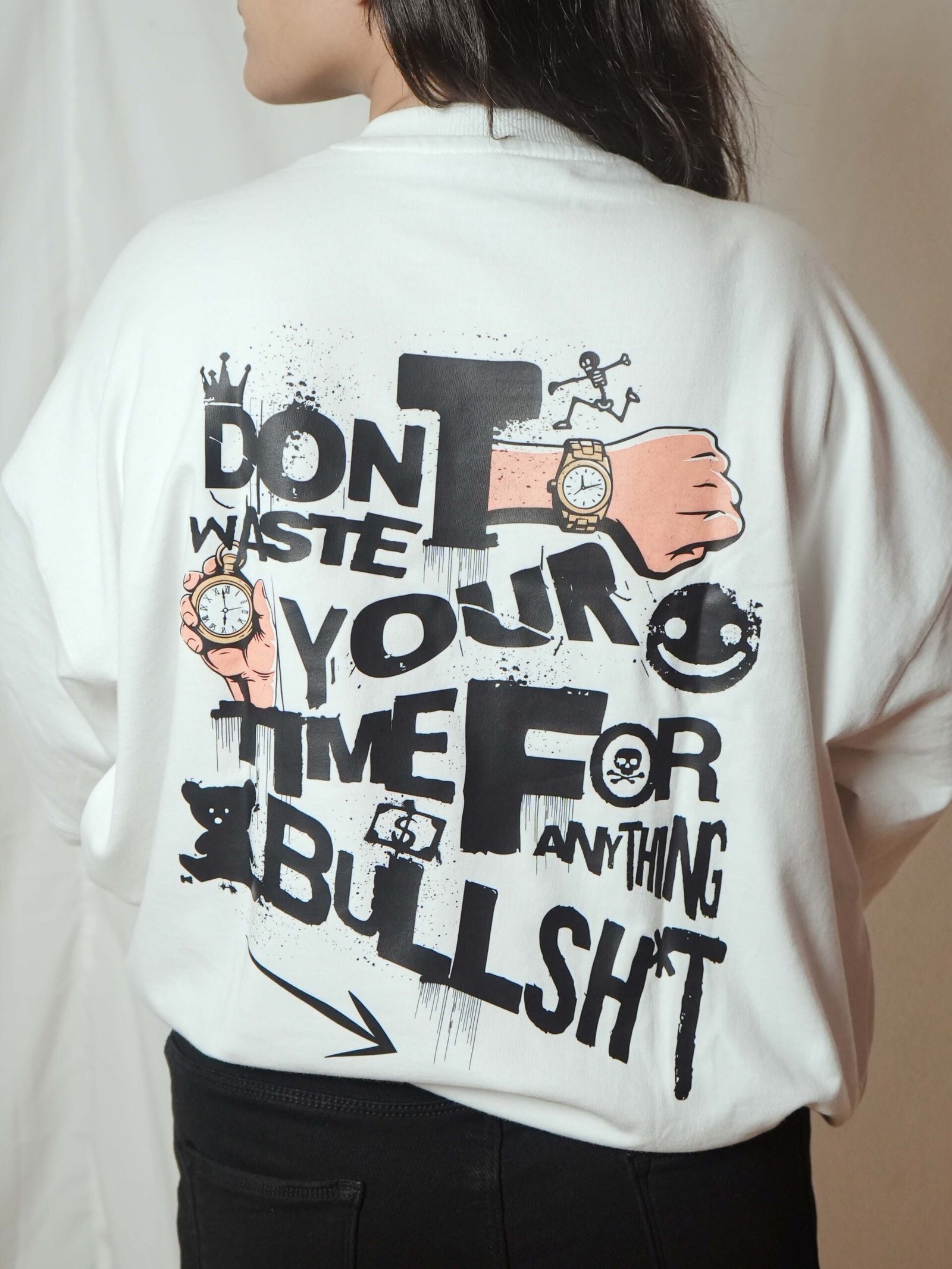 The “Time is Precious” tee delivers a raw graffiti message against a clean white background. With striking visuals of watches and bold lettering, this unisex oversized T-shirt is made for nonconformists who value their time above all. Crafted from 240 GSM cotton, it brings premium quality with a rebellious vibe.